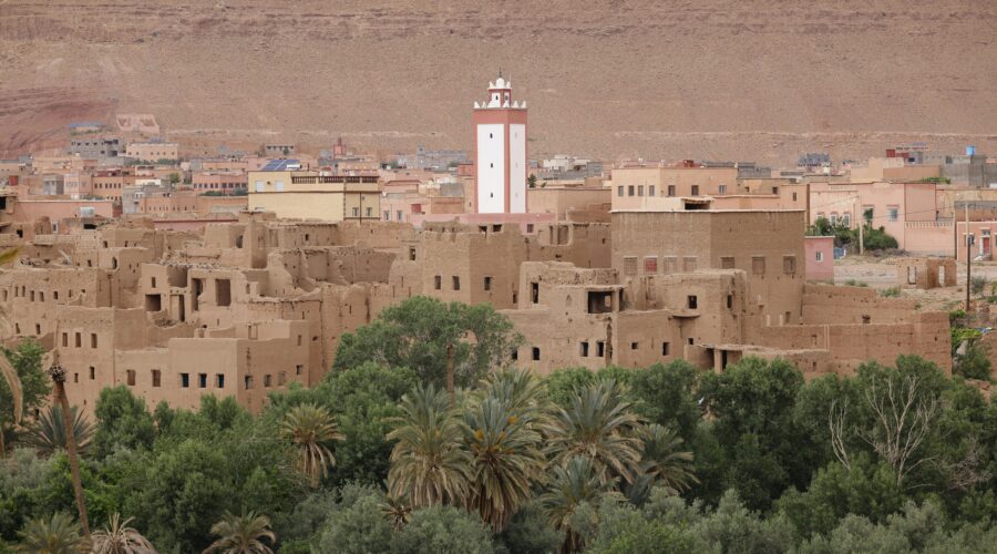 The route continues east through changing terrain shaped by rivers, agriculture, and centuries of travel. A stop in Tinghir offers views over a lush oasis where palm trees, kasbahs, and farmland create a vivid ribbon of green against the desert backdrop.